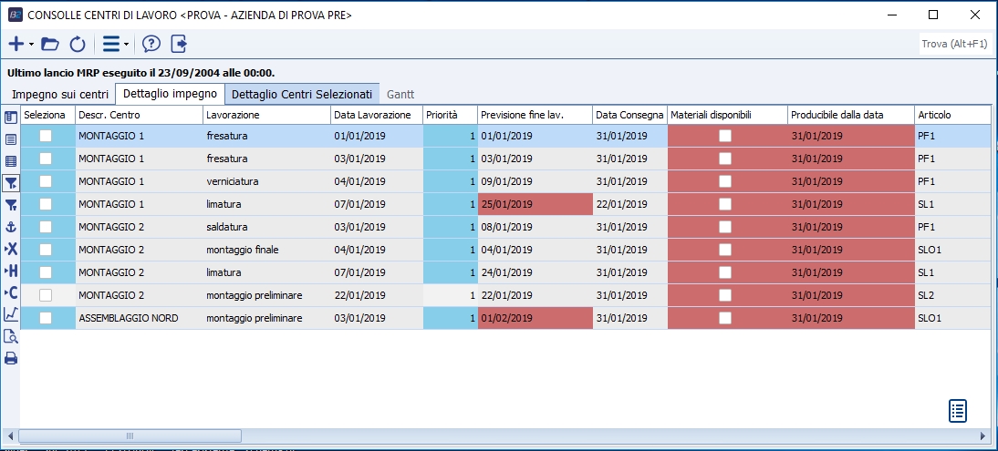 Problema riscontrato: quando appare la riga viene evidenziata in rosso, in tal caso la riga non genera il carico su 'Impegno sui centri' in quanto mancano delle informazioni fondamentali. Ad esempio il centro ha come tipo capacità 'Peso' ma non è indicato il peso nell'anagrafica articoli.