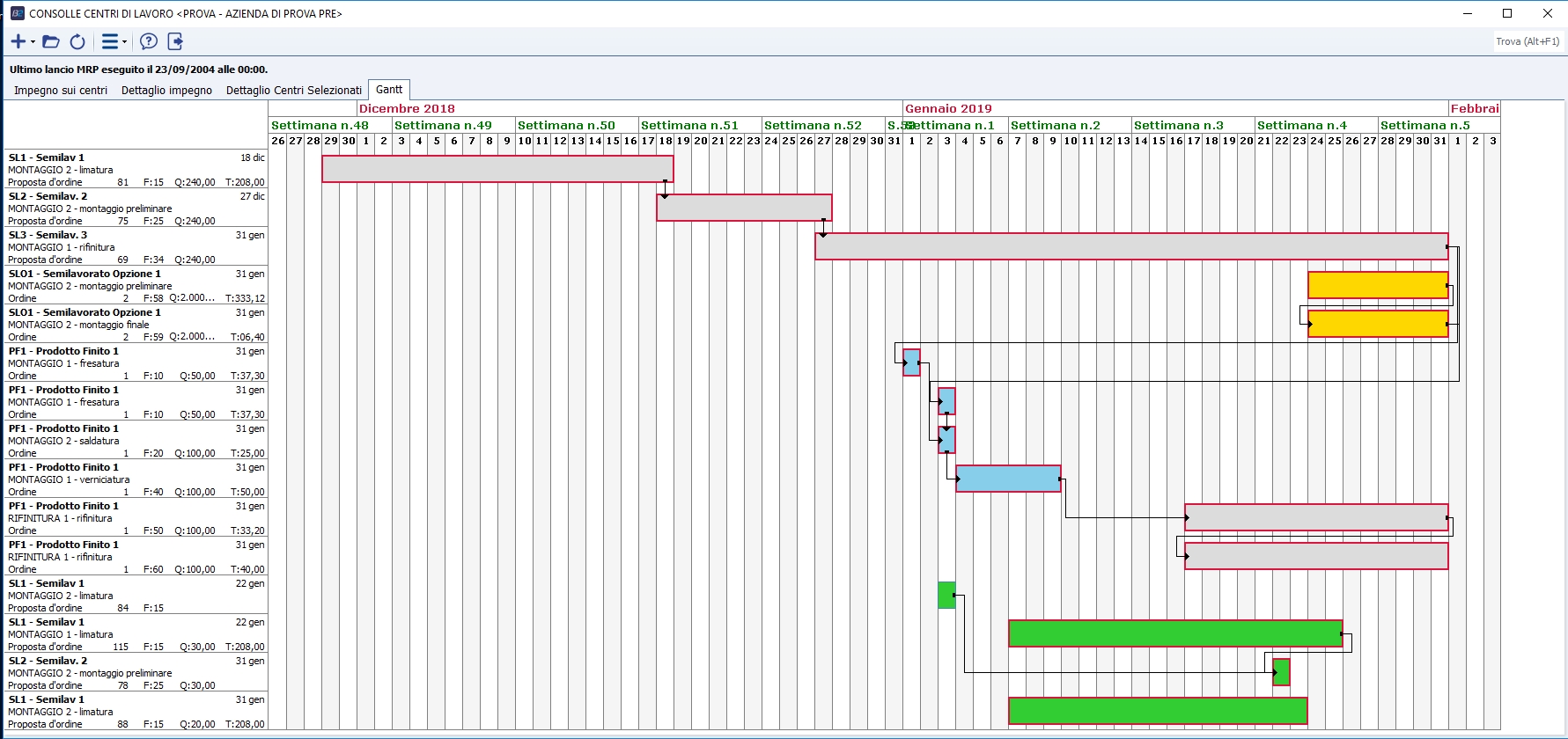 Il gantt mostra i legami padri\figli tra le lavorazioni, così come sono stati calcolati dall'ultima elaborazione MRP.