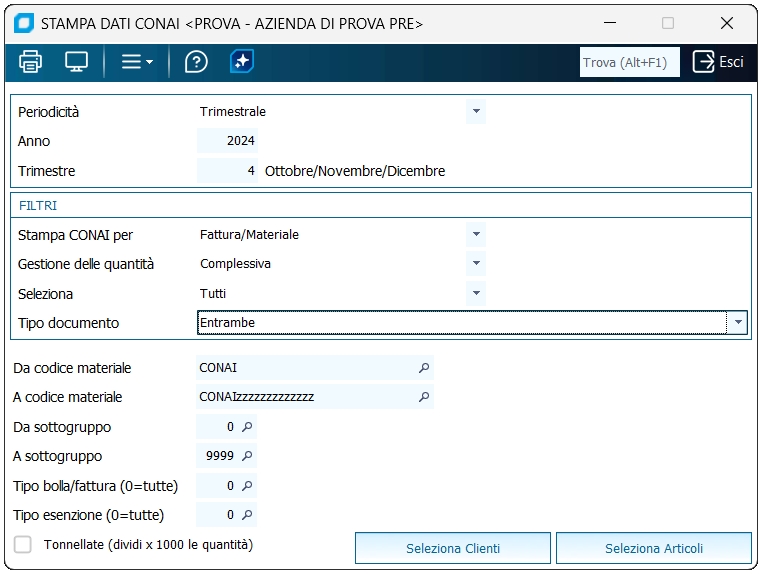 Da codice materiale / a codice materiale Seleziona gli articoli da considerare nella stampa. Gli articoli devono iniziare con la dicitura "CONAI".