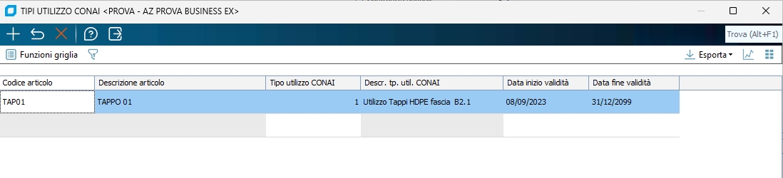 - In fase di inserimento di una riga documento dovrà essere proposto il codice utilizzo CONAI in base alla combinazione combinazione codice conto\codice articolo (stessa logica di Gestione ordini) sempre applicata la data di validità sulla data documento