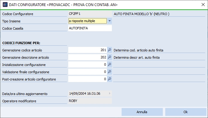 In tale ipotesi, il Cod. Casella-Insieme indicherà il Cod. Casella che dovrà avere la casella-insieme presente nel configuratore di livello superiore adibita a contenere al proprio interno tutte le caselle del configuratore di livello inferiore (in particolare la sua 1a istanza); Cod. Form./Funz. per generazione cod. articolo È obbligatorio, ed è il codice di una funzione o espressione VBScript che deve essere eseguita per determinare il cod. dell'articolo reale configurato in relazione alle scelte di configurazione effettuate. Cod. Form./Funz. per generazione descr. articolo È il codice di una funzione o espressione VBScript che sarà eseguita per determinare la descrizione dell'articolo reale configurato in relazione alle scelte di configurazione effettuate. Se non indicata, la descrizione dell'articolo reale configurato sarà impostata uguale alla descrizione dell'articolo neutro a cui è agganciato il configuratore da cui siamo partiti per fare la configurazione.