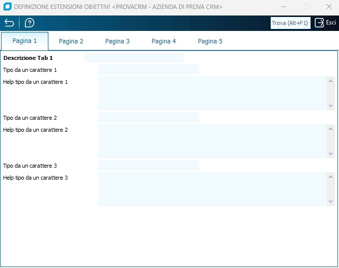 Campo memo 1 Indicare la descrizione (il nome, il significato) da attibuire al campo testo da n caratteri (che sarà presente nel terzo tab della finestra estensioni anagrafiche richiamata da anagrafica clienti/fornitori e anagrafica leads, occupando l'intero tab).