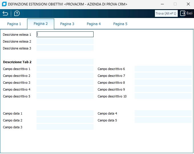 Campo data 1 Indicare la descrizione (il nome, il significato) da attibuire al primo campo data (formato gg/mm/aaaa) (che sarà presente sempre nel secondo tab della finestra estensioni anagrafiche richiamata da anagrafica clienti/fornitori e anagrafica leads).