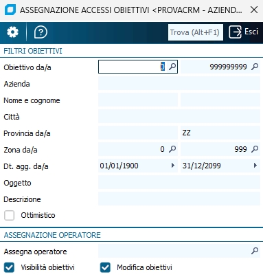 Moduli richiesti: CRM Il programma permette di assegnare ad un operatore l'accesso agli obiettivi in maniera massiva, per limitare la visualizzazione di obiettivi tra opeartori diversi o in caso di importazione massiva di obbiettivi dal programma Strumento per Import/Export. Il progrmma è suddiviso in due tile princilapi, il primo "FILTRI OBBIETTIVI" permette di filtrare per quali obbiettivi deve avvenire l'elaborazione, mentre il tile "ASSEGNAZIONE OPERATORE" permette di indicare a quale operatore verranno assegnati gli obbiettivi.