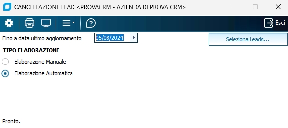 Tipo elaborazione Indicare "Elaborazione manuale" per confermare uno per uno i leads filtrati da cancellare dall'archivio, oppure "Elaborazione automatica" per eseguire l'elaborazione senza conferme.