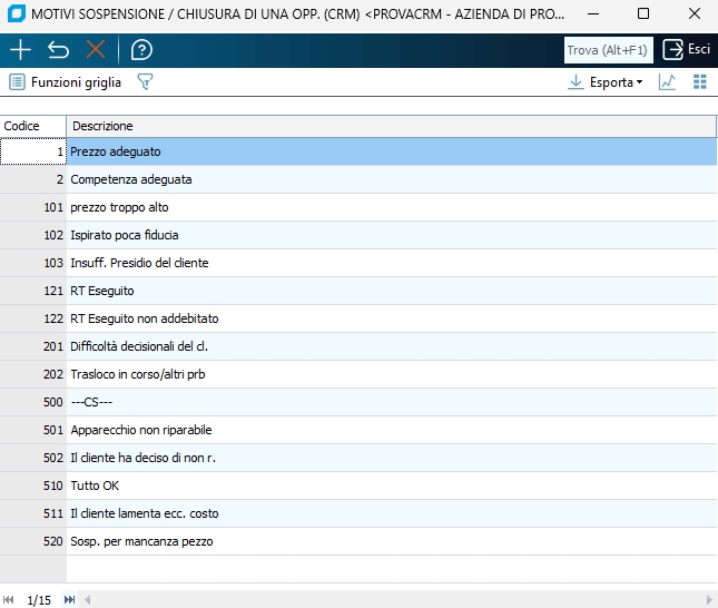 Con questo programma s'inseriscono le motivazioni per cui un'opportunità o trattativa commerciale può chiudersi positivamente, ad esempio per la fiducia ispirata al cliente, o negativamente, ad esempio causa prezzo troppo elevato, oppure sospendersi, ad esempio in attesa di finanziamento.
