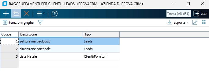 Questa tabella collega logicamente due o più liste selezionate clienti/fornitori/leads ad uno stesso criterio classificatorio, per gestire sistemi di classificazione che non si possono trattare con un campo in Anagrafica clienti/lead, ad esempio i campi canale, categoria, ecc.