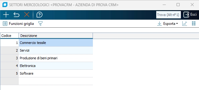 Moduli richiesti: CRM In questo programma è possibile indicare il settore merceologico, con un codice identificativo ed una descrizione riassuntiva, che viene poi usato in anagrafica dei Lead (Vedi Gestione lead) per identificare il loro settore merceologico di appartenenza.