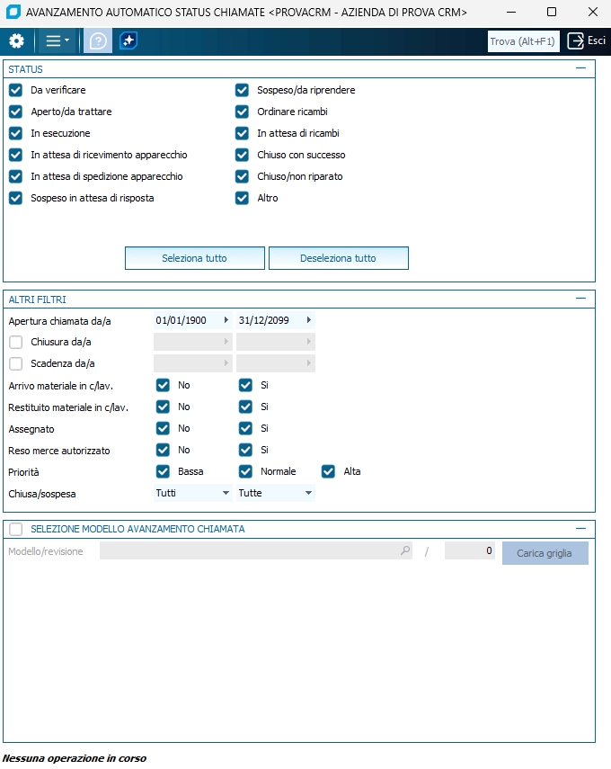 Moduli richiesti: Customer service Questo programma permette di selezionare un gruppo di chiamate e per ciascuna di queste viene verificato se, in base al modello di avanzamento attribuito, è presente uno status che prevede l'avanzamento automatico. Per ciascuna chiamata restituita dai filtri il programma provvede all'esecuzione della procedura 'Cambio status' e passa la chiamata allo status successivo.