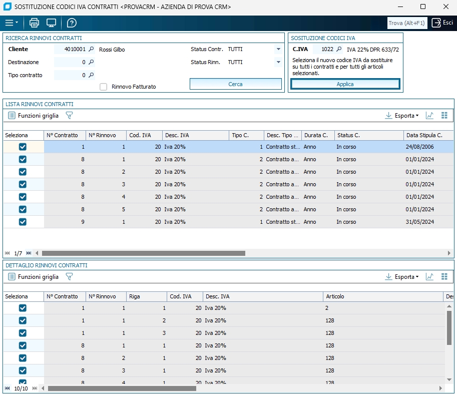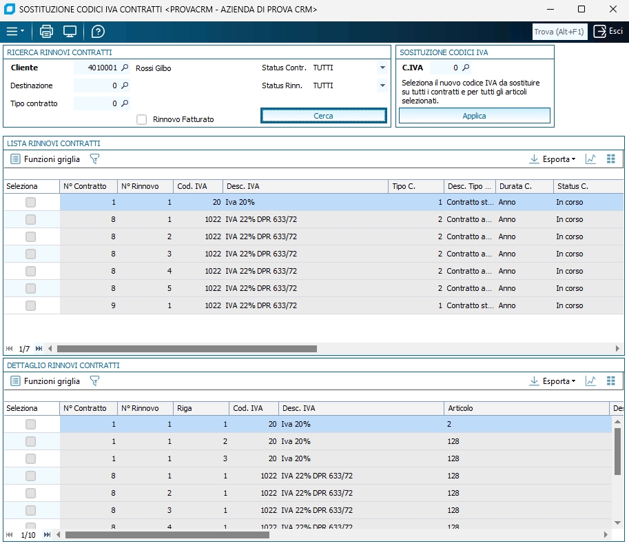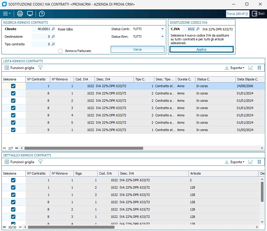 Cliente Per considerare solo i contratti di un determinato cliente. Destinazione Per considerare solo una destinazione diversa relativa al cliente. Tipo contratto Per considerare solo i contratti di un determinato tipo (tabella tipi contratto) indicare qui il codice relativo. Altrimenti lasciare a zero. Status contratto Per considerare solo i contratti con un determinato status, ad esempio 'In corso', 'Sospeso', 'Scaduto' ecc. Status rinnovo Per considerare solo i rinnovi con un determinato status, ad esempio 'In corso', 'Chiuso', ecc. Cerca Premendo questo tasto il software cerca tutti i contratti e i relativi dettagli che soddisfano i filtri inseriti nei campi descritti sopra. Il risultato della ricerca viene mostrato nelle griglie 'Lista Rinnovi Contratti' e 'Dettaglio Rinnovi Contratti'. Cod. IVA È il nuovo codice IVA da impostare in sostituzione di quello attualmente presente nella testata e nei rinnovi dei contratti selezionati. Applica Premendo questo tasto il codice IVA inserito nel campo 'C.IVA' viene sostituito su tutti i contratti e su tutti i relativi rinnovi attualmente selezionati, spuntando l'apposita colonna di griglia 'Seleziona', nelle griglie 'Lista Rinnovi Contratti' e 'Dettaglio Rinnovi Contratti'. Lista Rinnovi Contratti Contiene le informazioni di testata dei contratti trovati in base ai filtri soprastanti, a seguito della pressione del tasto 'Cerca'. Dettaglio Rinnovi Contratti Contiene le informazioni di dettaglio (rinnovi e distinta righe del rinnovo) dei contratti trovati in base ai filtri soprastanti, a seguito della pressione del tasto 'Cerca'. Menù Strumenti -- Auto Selezione Dettagli questa impostazione, se selezionata, è salvata nei recent e riproposta in automatico finché non viene deselezionata. Una volta attivata, alla selezione di un contratto nella griglia 'Lista Rinnovi Contratti', sono selezionate automaticamente le relative righe di dettaglio nella griglia 'Dettaglio Rinnovi Contratti'. ESEMPIO