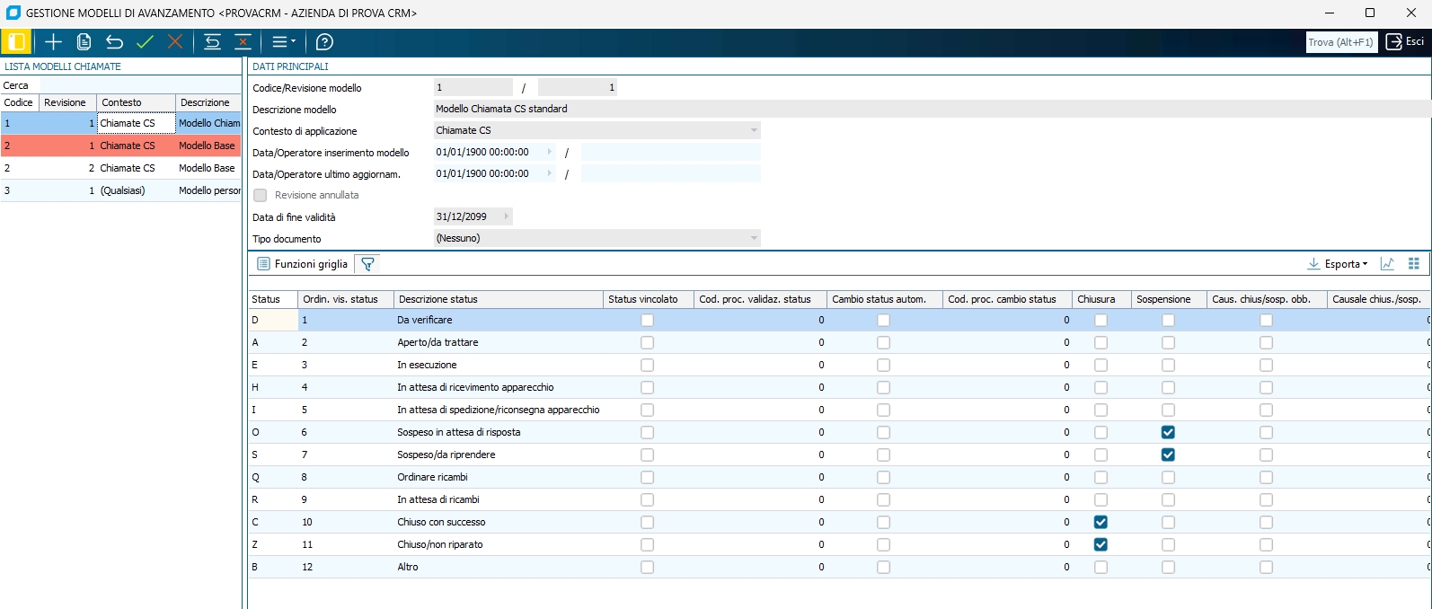 La struttura dei modelli di Avanzamento è operativa, per il momento, solo su Gestione Chiamate del modulo CS;