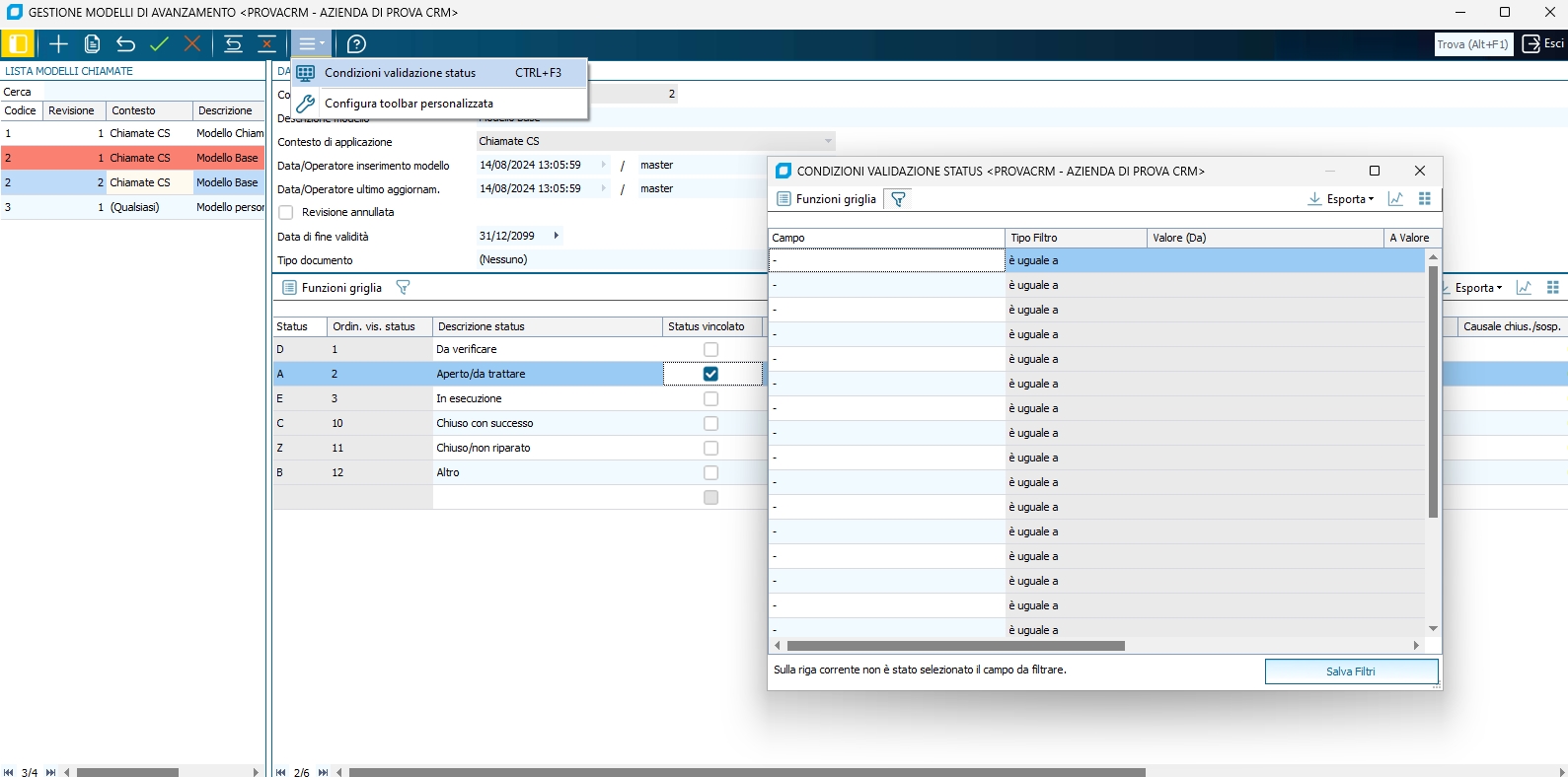 Le regole possono essere definite tramite la voce "Condizioni validazione Status" del menù "Strumenti", attingendo dai dati delle tabelle fondamentali gestite nella chiamata (Cliente, Estremi chiamata, Contratti, Parco Installato,etc.).