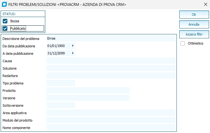 Questo programma permette di inserire e pubblicare testi strutturati che descrivono problemi tecnici ricorrenti e indicano possibili soluzioni tecniche, per costituire una base di conoscenza ad uso e consumo dei tecnici che forniscono i servizi di assistenza ed anche, se si pubblicano queste informazioni sul Web, con apposite pagine dinamiche non comprese nelle funzionalità di Business, per i clienti e utilizzatori finali dei prodotti forniti dall'azienda. Il programma permette anche la ricerca di informazioni in base a vari filtri. Dallo status di partenza si può selezionare: - Nuovo, per inserire un nuovo "articolo" (cioè testo); - Cerca, per cercare un articolo in base a vari criteri, visibili nella finestra sotto riportata: