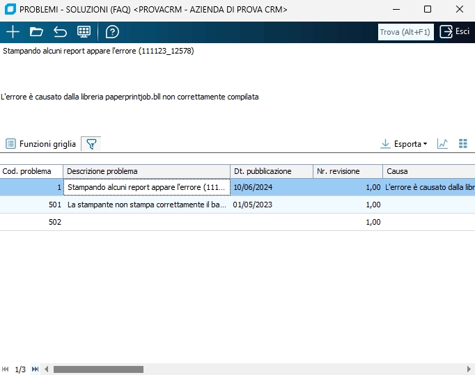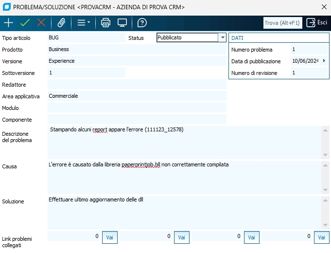 Problema numero Identifica in modo univoco il problema (e la soluzione relativa), è attribuito dal programma in modo automatico. Data pubblicazione Indicare la data in cui l'articolo è inserito in archivio, o pubblicato. Revisione Indicare, se utile, il numero della revisione dell'articolo stesso. Status Indicare "bozza", se ancora ad uso interno; indicare "pubblicato" se l'articolo è già stato reso pubblico ai tecnici o ai clienti. Su questo campo è possibile fare ricerche se l'applicazione è installata con database SQL Server. Descrizione del problema Indicare brevemente il testo da attribuire al problema, utile per una prima ricerca, di massimo 255 caratteri. Causa Indicare in modo esteso la causa del problema, o come riprodurlo. Soluzione Indicare in modo esteso la soluzione, se disponibile, o un rimedio al problema. Su questo campo è possibile fare ricerche se l'applicazione è installata con database SQL Server. Quelli che seguono sono campi aggiuntivi di categorizzazione e ricerca. Tipo articolo Indicare il tipo di articolo con una sigla di max 4 caratteri alfanumerici, con valori da prevedere in precedenza. Un esempio può essere: FAQ = frequent asked question, BUG = problema noto del software, PRB = problema operativo, ecc. Prodotto Indicare eventualmente il codice dell'articolo/prodotto a cui ascrivere il problema. Versione Indicare descrittivamente le versioni, con i loro identificativi tecnici, del prodotto col problema sopra indicato. Sottoversione (Sub.Vers) Se il problema si riferisce a una specifica versione del prodotto, è possibile indicare (4 caratteri max) un identificativo di sottoversione. Redattore Indicare, se utile, il nome o la sigla della persona che ha redatto l'articolo. Area applicativa Indicare, se utile, a quale area applicativa si applica il problema. Modulo Se il prodotto è fatto di moduli, indicare il modulo a cui il problema si riferisce. Descrittivo. Componente Se il prodotto è fatto di vari componenti, indicare descrittivamente, o per sigle, il componente coinvolto. Link problemi collegati In questi 4 campi numerici è possibile indicare (ricercare con la funzione Zoom solita) altrettanti problemi collegati. In presenza di collegamenti tra articoli correlati, è possibile scorrerli e passare da uno all'altro con una tecnica simile al browser; con i pulsanti in alto nella barra degli strumenti è possibile "navigare", come in Internet Explorer. |