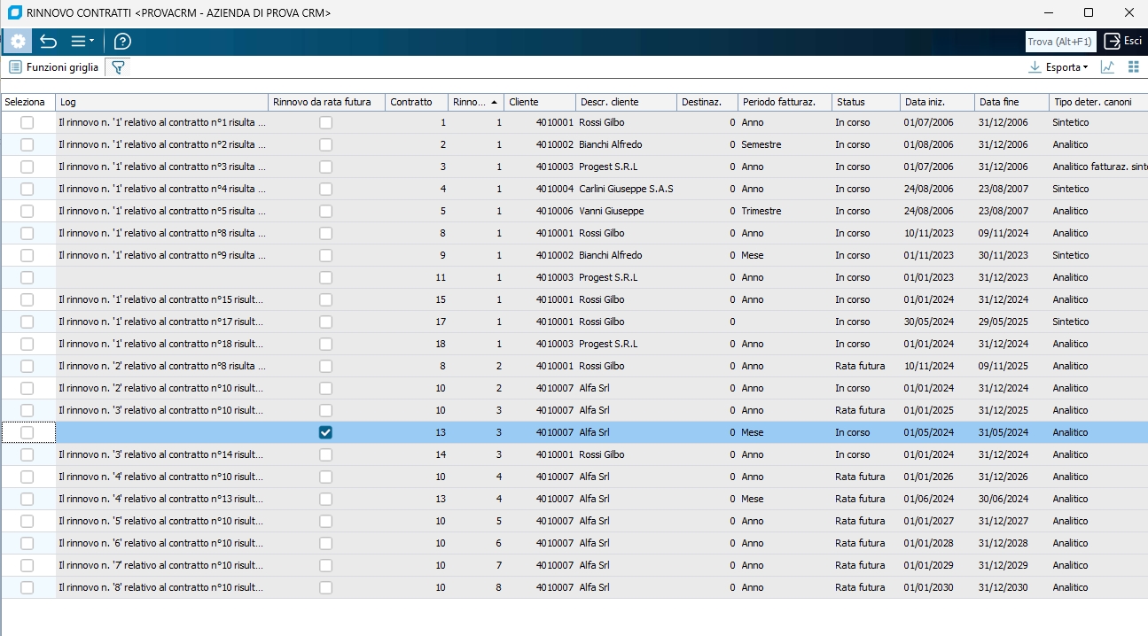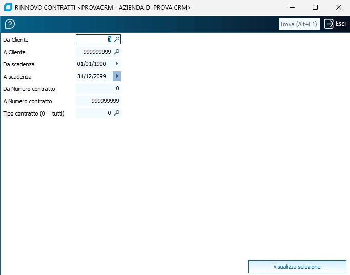 Da cod. Cliente / A cod. Cliente Per considerare solo i contratti di un determinato cliente o di un range di codici cliente, indicare in questi due campi il primo e l'ultimo di essi. Da data scadenza / A data scadenza Indicare la data iniziale e la data finale del periodo in cui i contratti da rinnovare sono in scadenza, intese come date scadenza periodo sui dati del rinnovo. Da num. contratto / A num. contratto Per considerare solo un determinato contratto o un range di codici identificativi contratto, indicare in questi due campi il primo e l'ultimo di essi. Tipo contratto Se si vuole trattare solo i contratti di un determinato tipo (tabella tipi contratto) indicare qui il codice relativo. Altrimenti lasciare a zero. Seleziona periodo Solo per i contratti con "Fatturazione ratei nel primo periodo", è possibile indicare in questi due campi il numero periodo e l'anno periodo da considerare come filtri nella selezione dei contratti da rinnovare.