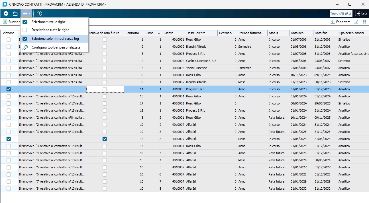Seleziona solo rinnovi senza log, questa funzione permette di selezionare solo ed esclusivamente i rinnovi che non presentano un messaggio di log, al lancio di questa funzione, verranno sovrascritte eventuali selezioni precedenti.