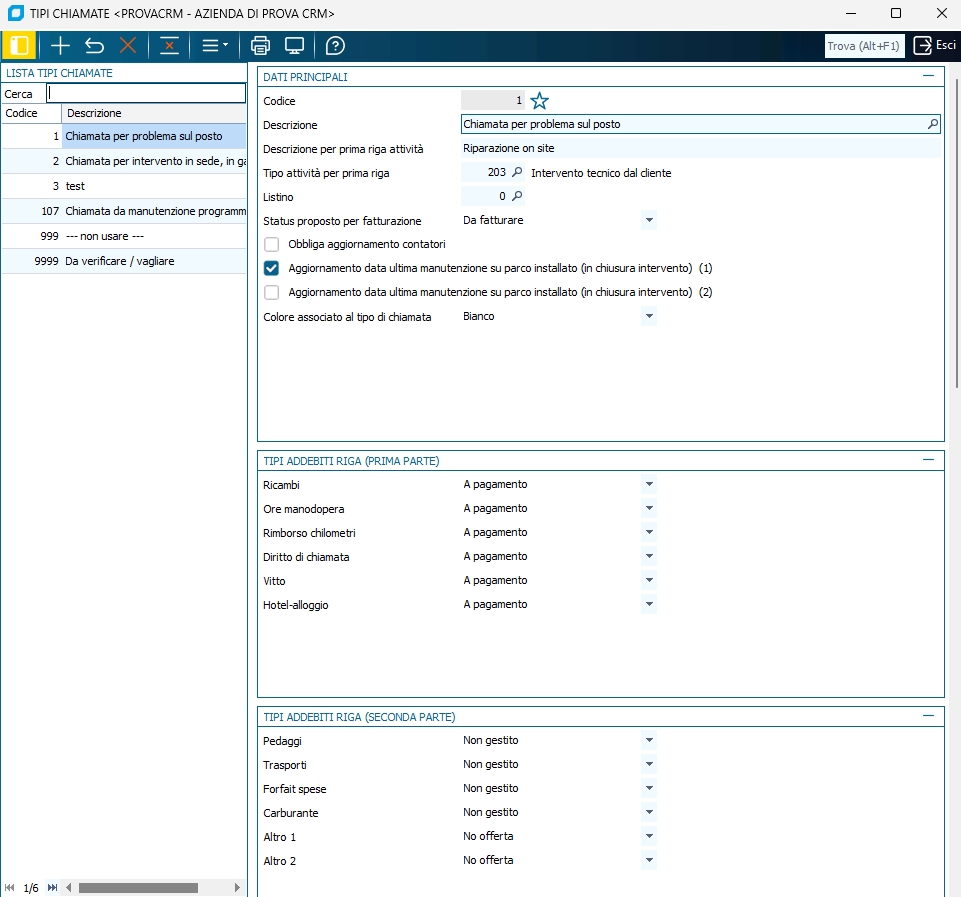Questo programma permette di gestire la tabella che definisce le varie tipologie di chiamate (/interventi tecnici) di assistenza, in base alle regole che si applicano a ciascuna di esse in merito all'addebito o meno di ricambi e di altre voci.