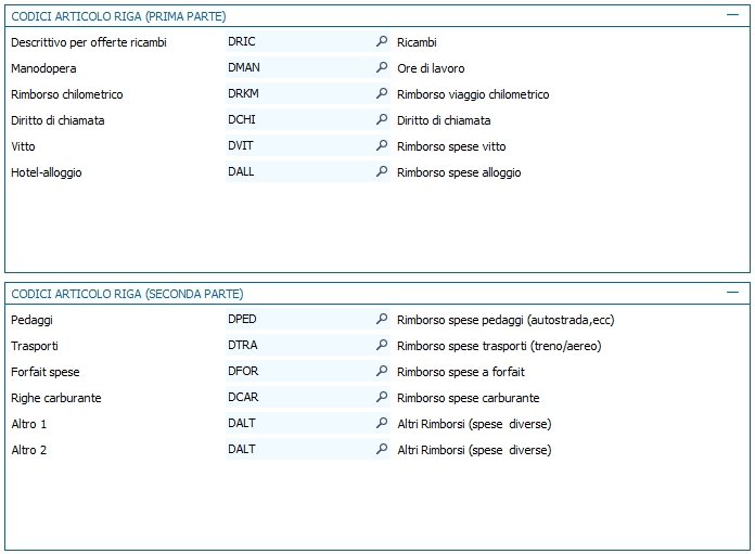 Per tutti gli altri Codici articolo riga valgono le stesse considerazioni dei ricambi.