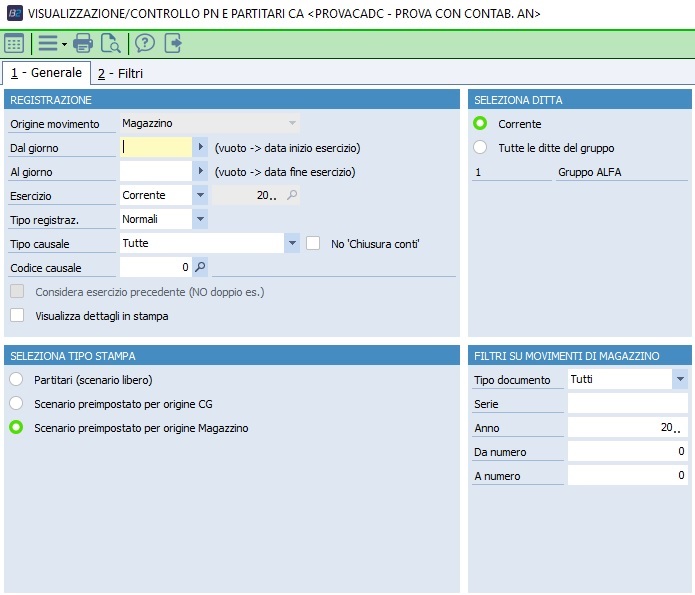 Visualizzazione - Stampa Partitari - Prima Nota di Contabilità Analitica | |||
