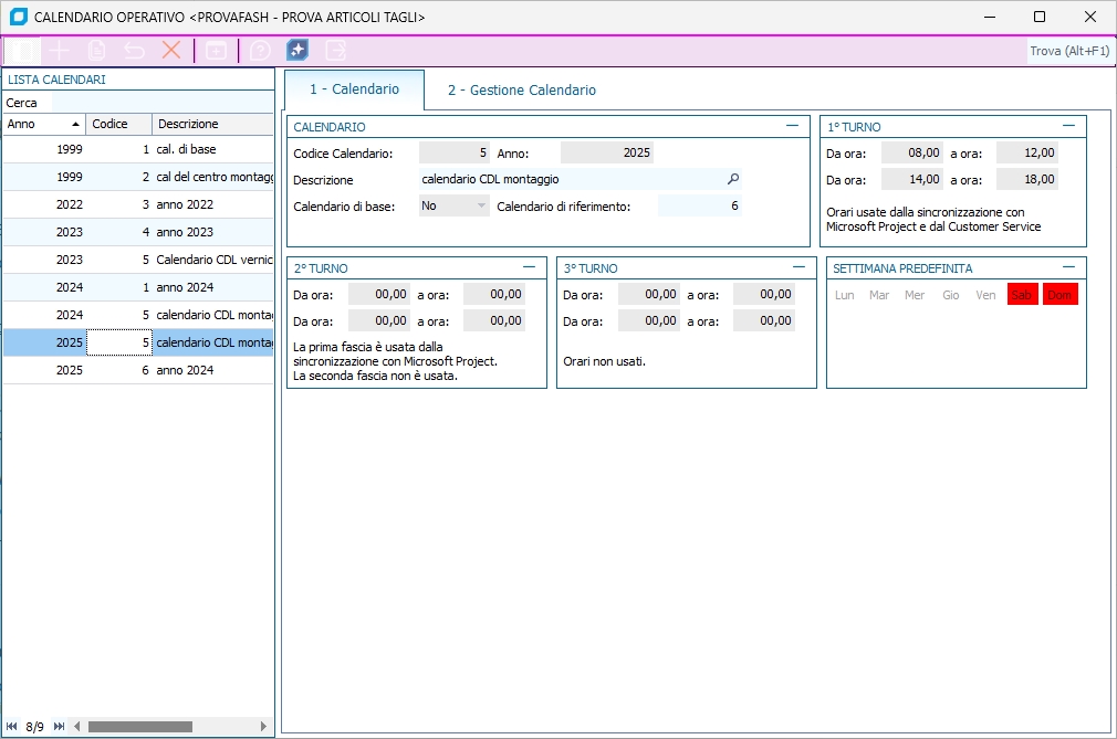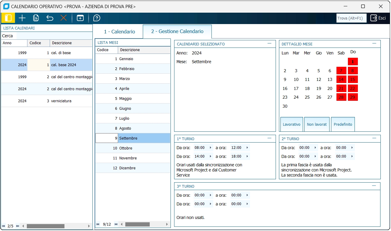 Questa procedura permette d'inserire uno o più calendari da utilizzare per una più corretta gestione dell'MRP. Il calendario standard di Business non considera le festività o i periodi di ferie, è in grado di riconoscere solo i sabati e le domeniche: con questo strumento è possibile generare diversi calendari al fine di programmare l'attività in maniera più precisa per i diversi centri di lavoro.