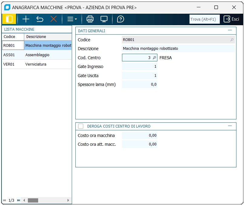 Codice codice identificativo della macchina Descrizione descrizione della macchina Cod. Centro indica il Centro di lavoro in cui si trova la macchina. Gate Ingresso questo campo identifica il numero di ingressi che ogni macchina prevede nella fase di caricamento materiale (materie prime/semilavorati) per iniziare la lavorazione. Gate Uscita questo campo identifica il numero di uscite che ogni macchina prevede per scaricare il materiale (prodotto finito) al termine della lavorazione.