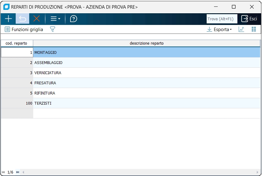 Codice Reparto Indicare un numero, compreso tra 1 e 999, che identifica il reparto all'interno dell'azienda. Descrizione Indicare la descrizione del reparto ad es. FRESATURA. |