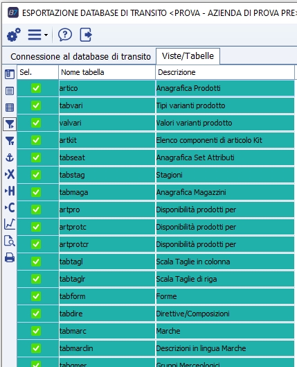 La pressione del pulsante 'Connetti' mostrerà in elenco tutte le viste e le tabelle presenti nel database di transito.
