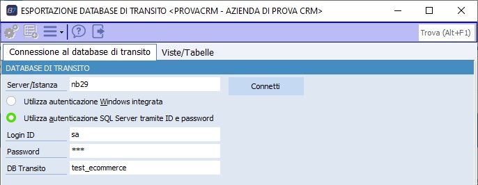 Il programma consente di esportare in formato CSV le tabelle o viste del database di transito dell'e-commerce e di inviare i file in un'area FTP, i cui dati sono specificabili sulle opzioni di registro del programma. In apertura del programma viene visualizzata la maschera per collegarsi al database di transito, i valori inseriti sono recentati e verranno riproposti alla successiva apertura del programma.