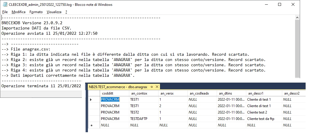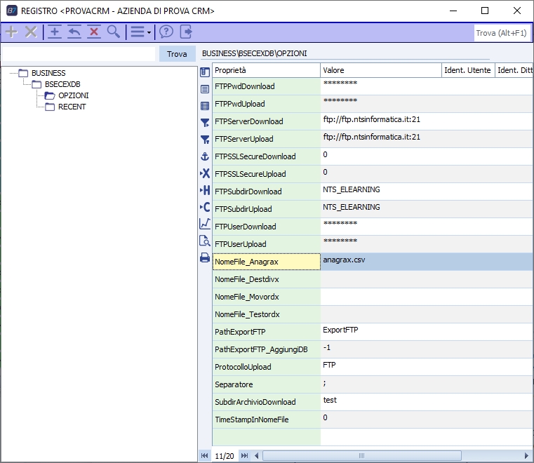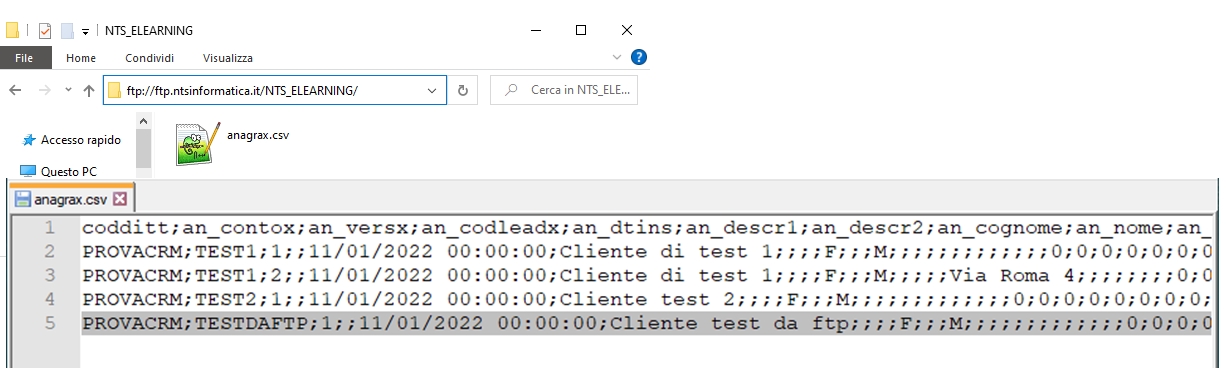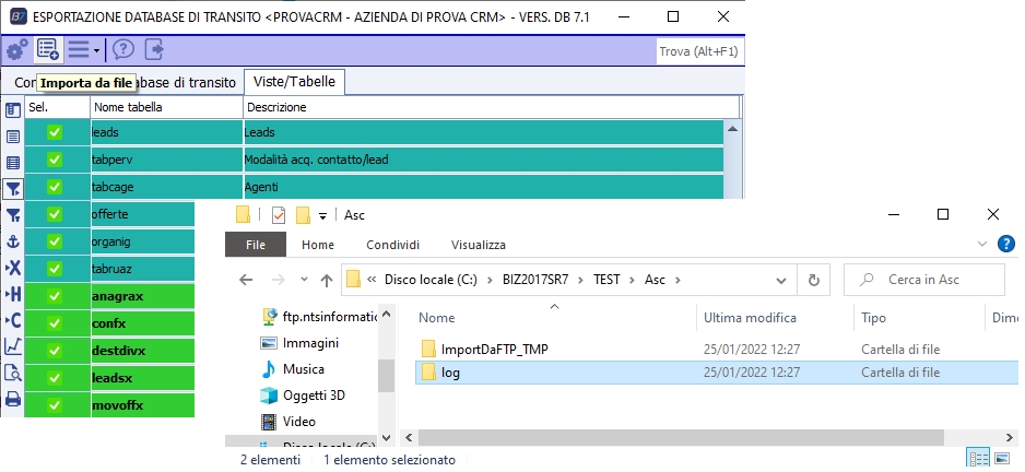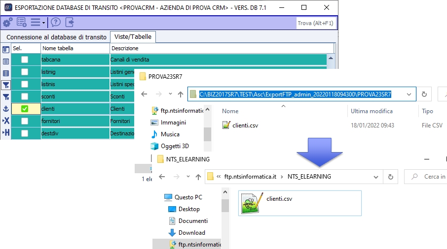 Selezionando una o più delle viste/tabelle e premendo il pulsante "Esporta" verrà avviata l'esportazione. Viene creata la cartella di destinazione locale in base alle impostazioni scelte (vedi opzioni) e verranno generati i file CSV (un file per ogni vista/tabella selezionata). NB : se una vista/tabella NON contiene dati NON verrà esportata. Al termine dell'esportazione i file vengono copiati nella cartella FTP indicata (vedi opzioni) e la cartella di esportazione locale viene eliminata o meno a seconda della scelta dell'utente nella relativa opzione di registro. Tramite le voci a menù è possibile selezionare o deselezionare tutte le viste/tabelle. La creazione del file per la schedulazione imposterà, nella schedulazione, le viste/tabelle selezionate al momento del click su "crea file per la schedulazione". Ad esempio con la seguente configurazione: