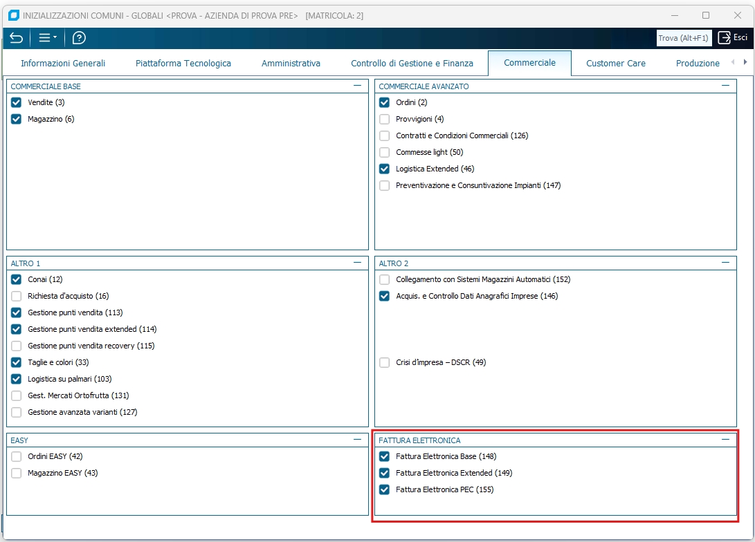 3. Abilitare in "Inizializzazioni comuni globali" (1.6.N), tale modulo che risiede nel tab "Commerciale", tile "FATTURA ELETTRONICA" e al salvataggio premere SI per abilitare il modulo sui Servizi abilitati a livello di Anagrafica Ditta. Se a fianco del modulo compare un (*) significa che il modulo non è attivo nella chiave attualmente installata. Sarà necessario procurarsi quindi una chiave di attivazione aggiornata. NB. Abilitato il modulo è necessario uscire e rientrare da Business.