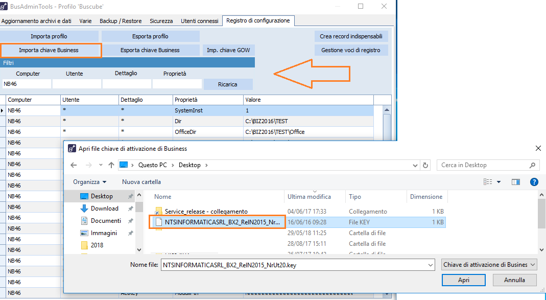 3 La fatturazione elettronica in Business 3.1 Installazione del nuovo modulo Per gestire l'emissione e la ricezione di fatture elettroniche Nts Informatica ha reso disponibile il nuovo programma Consolle Fatturazione elettronica accessibile dai seguenti percorsi dal menu: 2.1.E, 4.1.I oppure avviandolo manualmente digitando il nome del programma BNFECONS. L'utilizzo del programma è sottoposto a modulo BX-148 "Fatturazione elettronica base". E' quindi necessario: 1. Disporre di una chiave di attivazione in cui il relativo modulo sia attivato; 2. Installare la nuova chiave con lo Strumento di amministrazione di business (BusAdminTools) dall'apposito comando. Quindi selezionare il file con estensione. KEY.