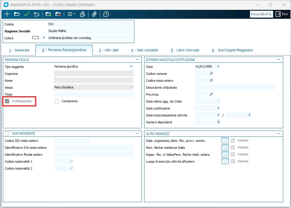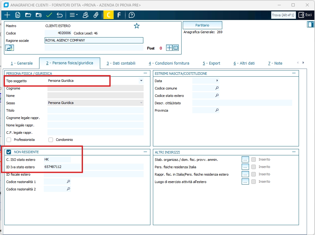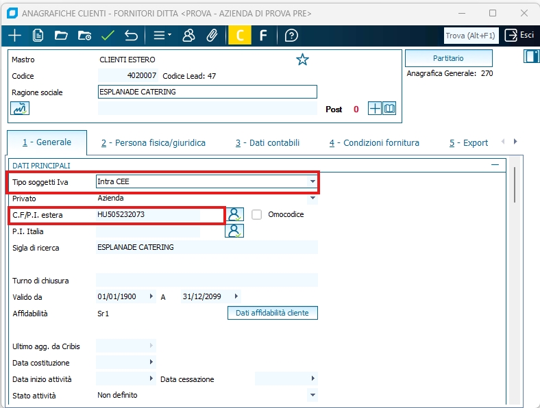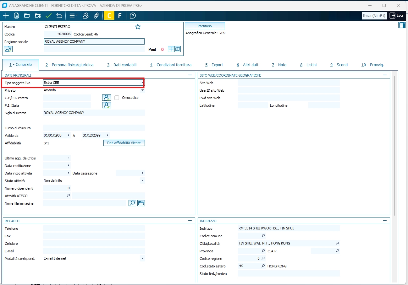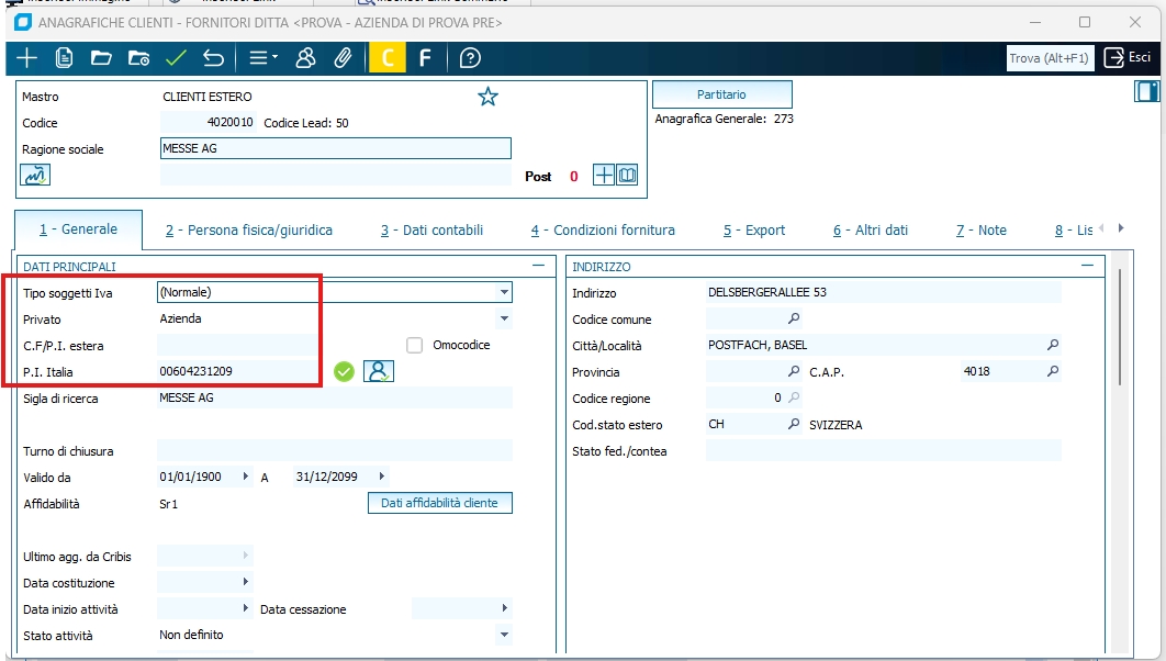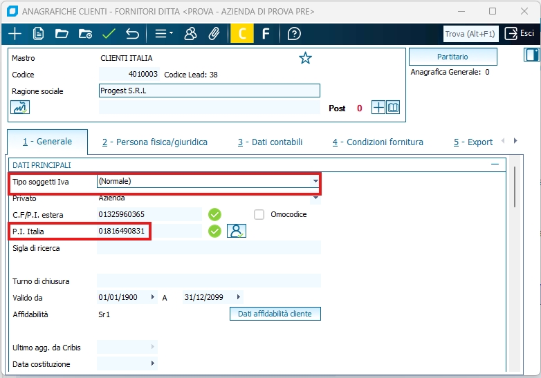 Anzitutto per i soggetti passivi IVA dovrà essere verificato che il tipo soggetto IVA sia Normale e che sia inserita la partita IVA nel campo Partita IVA Italia