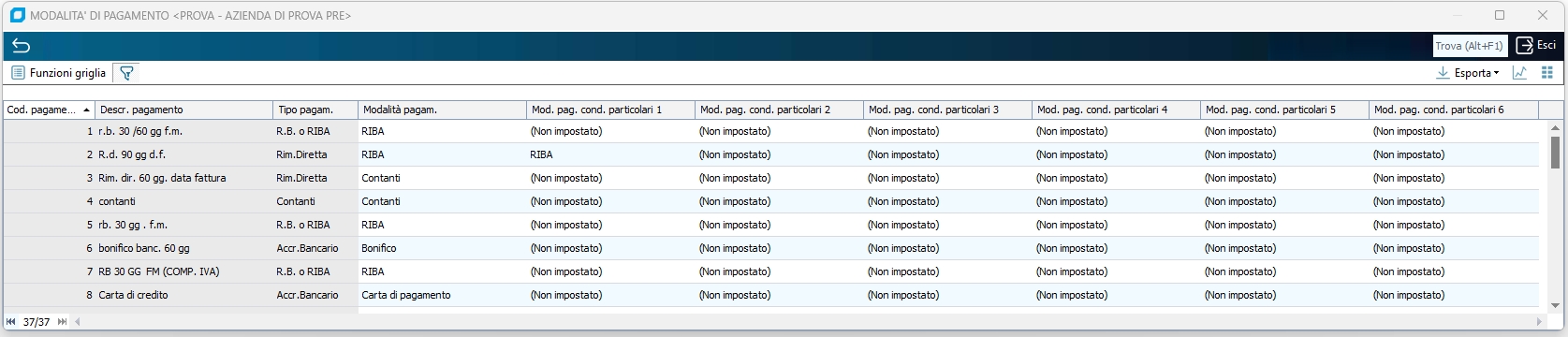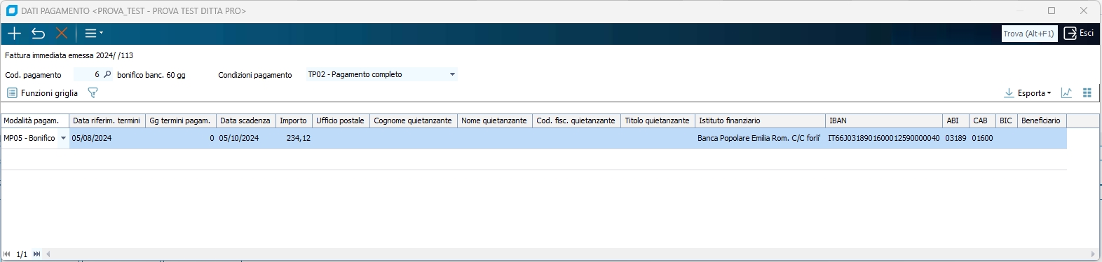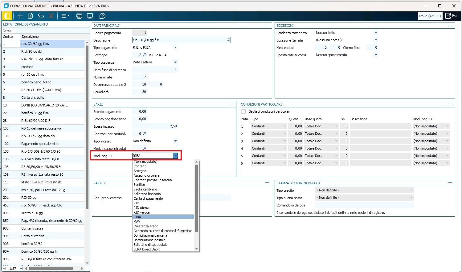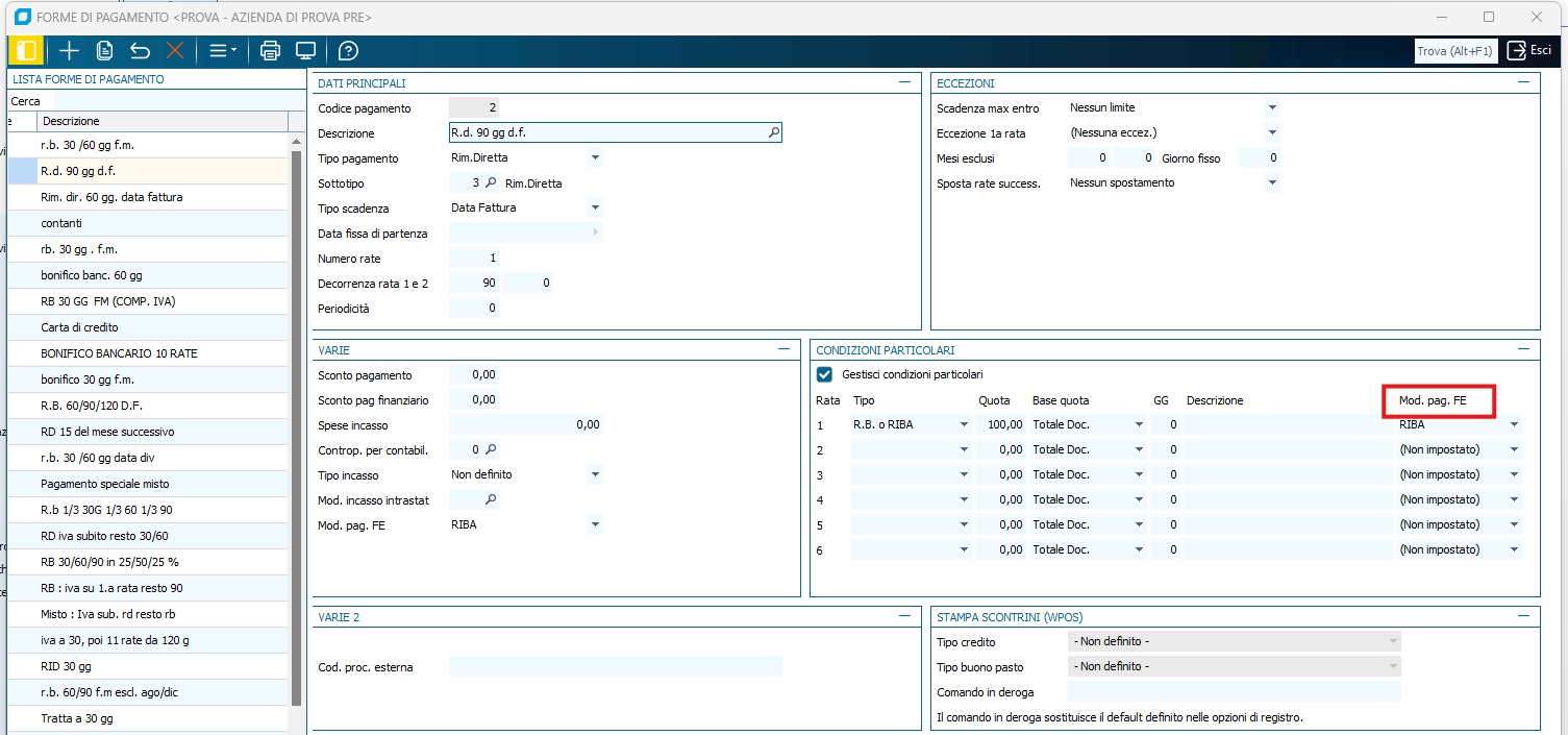 Nelle forme di pagamento utilizzate è necessario specificare la Modalità pagamento FE tra quelle indicate nell'apposita combo box