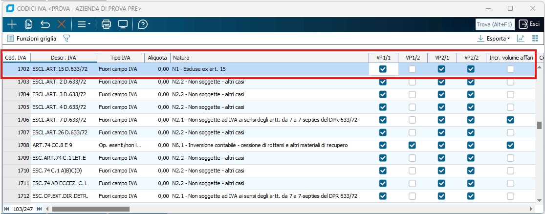N1 – Escluse ex art 15 Sono considerate tali le registrazioni in cui il CODICE IVA in cui il Tipo IVA è Fuori campo IVA e il sottotipo IVA è impostato su Escluso art. 15. Per le versioni inferiori alla Net 2015 UE7 invece non essendoci il campo Sottotipo IVA si verifica che nella descrizione del codice IVA ci sia il testo '15'.