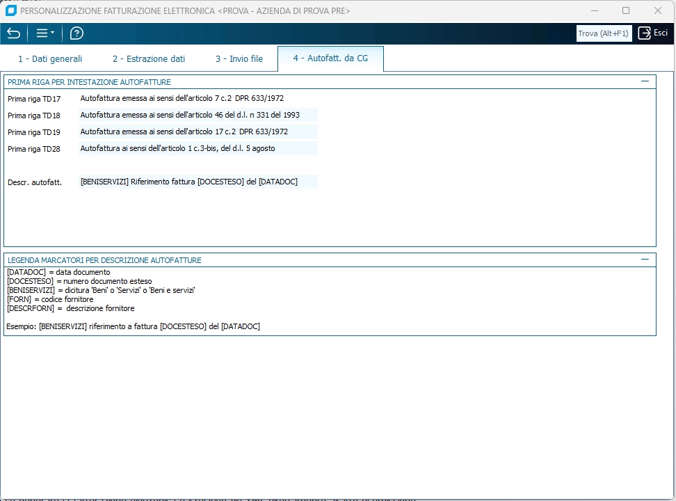 Attivando l'opzione questi riferimenti non verranno più riportati, ma il corpo della fattura figurativa verrà popolato con una riga per corrispettivo con i riferimenti del documento. (Default 0)."