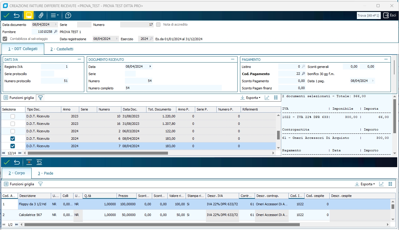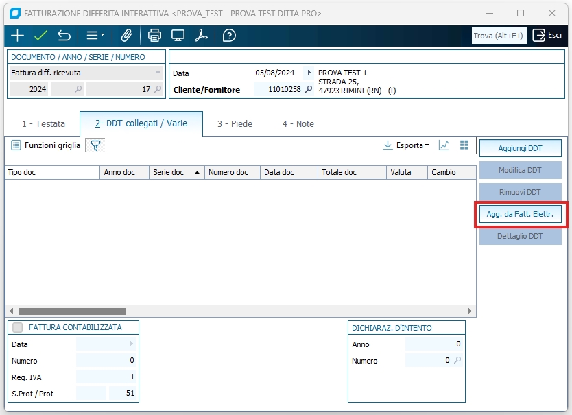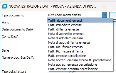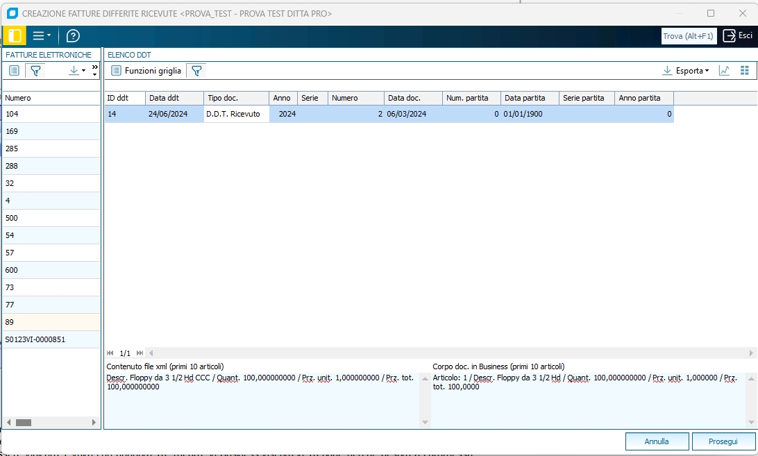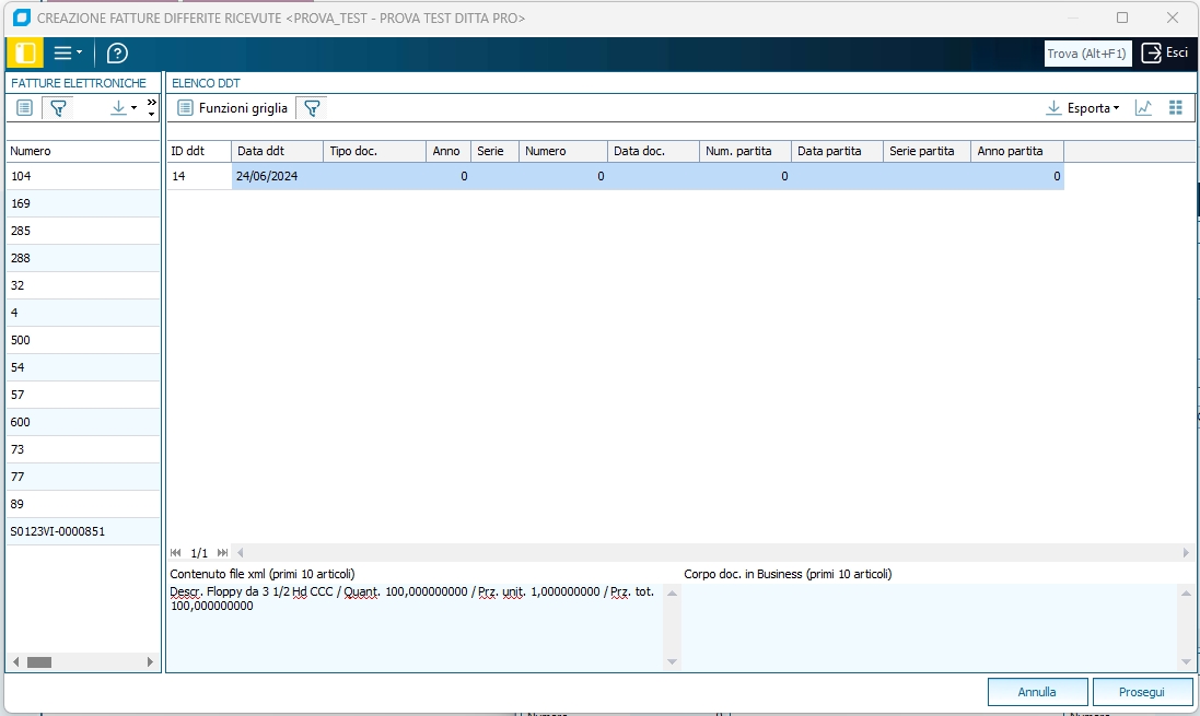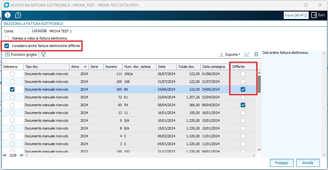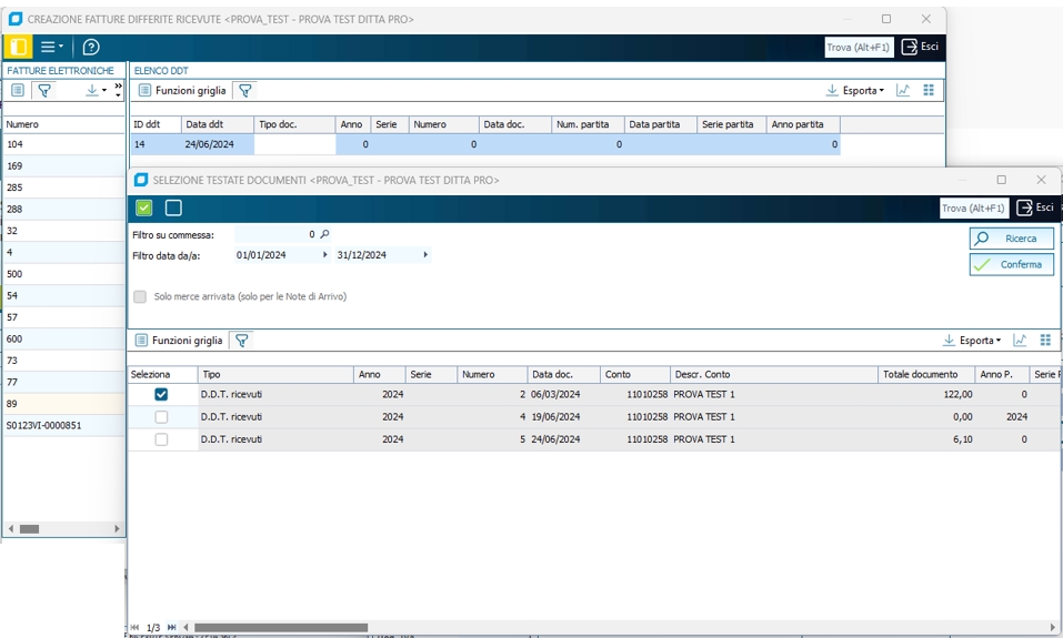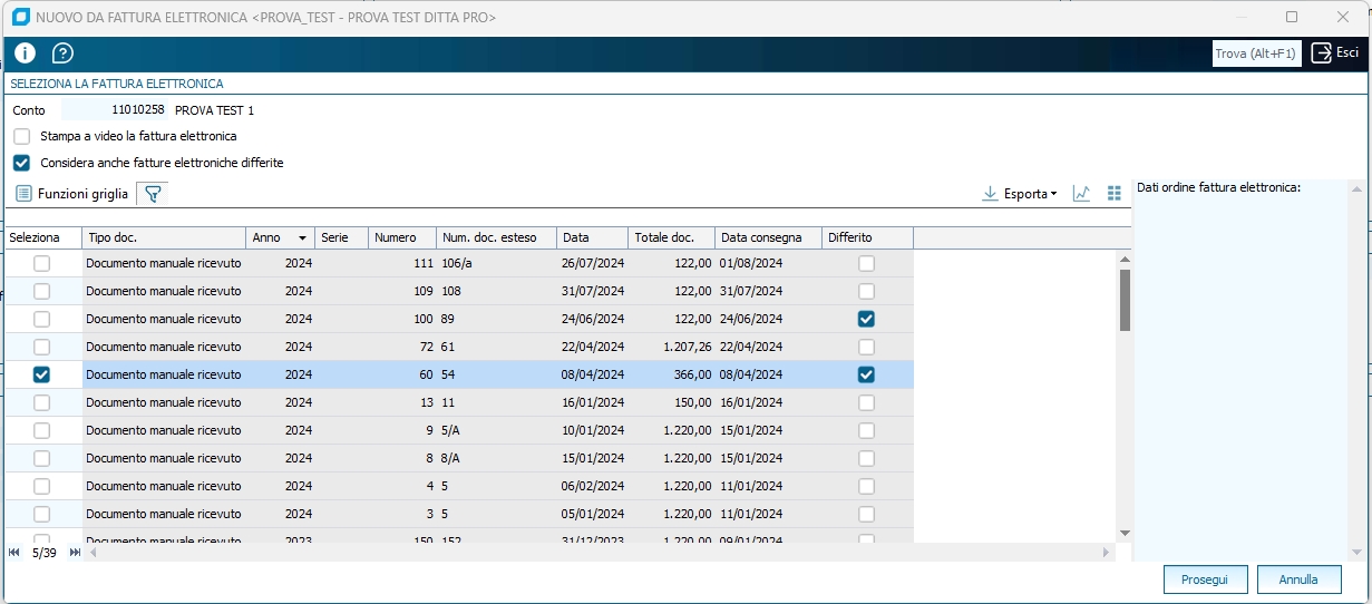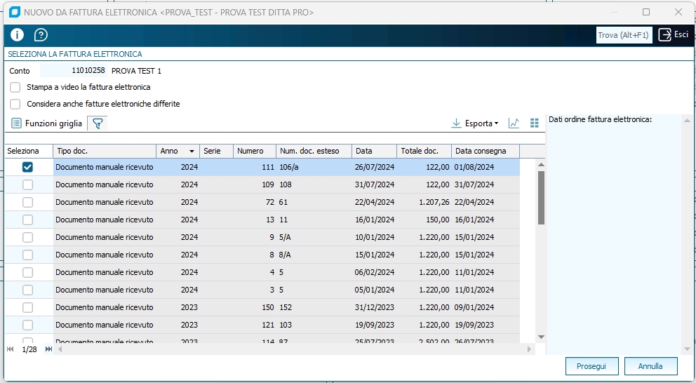 N.B fare attenzione a compilare il campo "partita documento ricevuto" nel piede del documento altrimenti la fattura non verrà estratta.