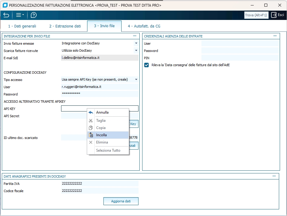 Per poter inserire i valori di codice destinatario e indirizzo PEC della Ditta sono state create due opzioni di registro: