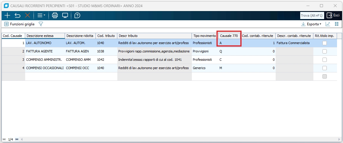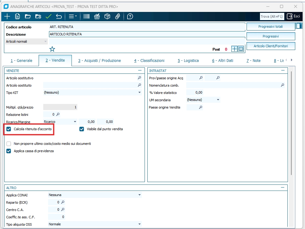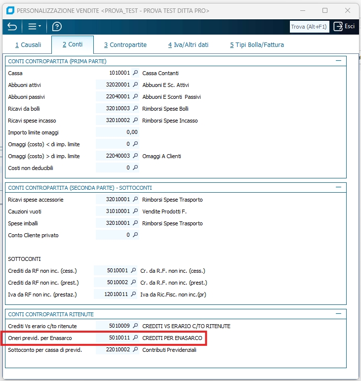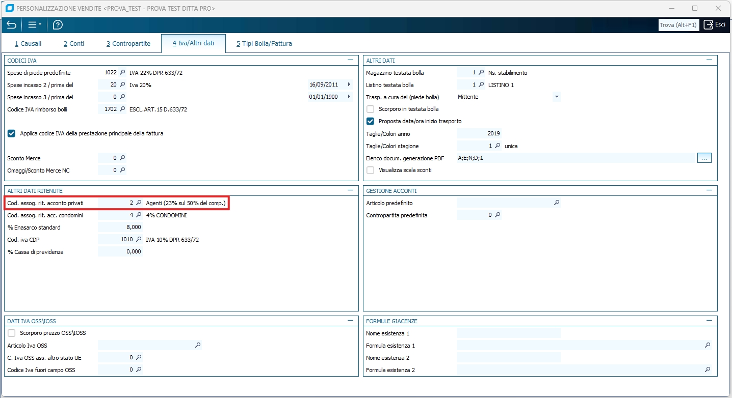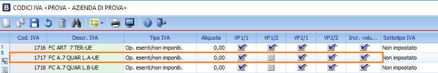 N4 – Esenti. Si tratta di operazioni esenti come ad esempio le operazioni sanitarie. Il codice IVA deve essere impostato su Tipo IVA come 'Op.esente/non imponib.' e il check 'Esenti pro-rata spuntato'. Vanno spuntate le colonne VP1\1,VP1\2,VP2\1,VP2\2. Esempi di codici IVA standard sono: 1801,1802,1803,1804