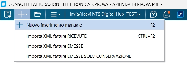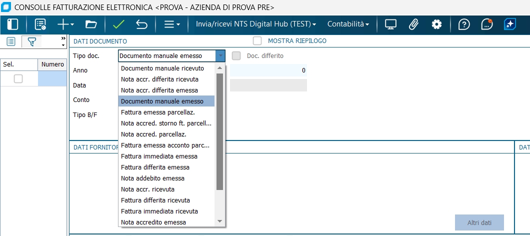 Se non si vuole gestire la fattura in magazzino è possibile inserirla direttamente da consolle fe, come documento manuale emesso intestato al fornitore esonerato ed indicando il tipo bolla/fattura mostrato sopra.
