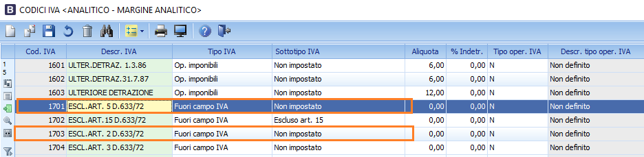Rientrano in questa ipotesi anche le operazioni fuori campo non art.15. In questo caso il codice IVA deve essere Tipo IVA Fuori campo IVA e Sottotipo IVA impostato su nessuno (per le release inferiori alla NET 2015 UE7 non ci deve essere il 15 nella descrizione). Esempi sono i codici IVA standard 1701 e 1703