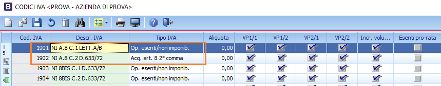 N3 – Non imponibili. Trattasi di operazioni che ricadono nel regime della non imponibilità come ad esempio un'esportazione o una cessione intra-UE. In questo caso va impostato nel tipo IVA 'Op.esente/non imponib.' o 'Acq.art 8 2° comma' Ed Esente pro-rata non spuntato. Esempi nei codici IVA standard sono: 1901, 1902, 1931