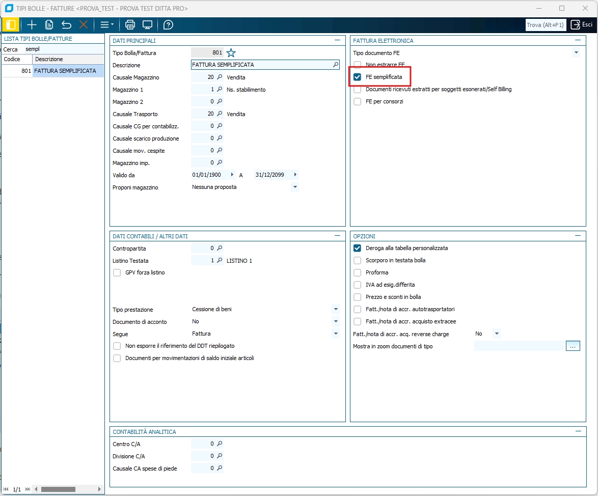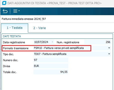 Per questi documenti, quindi, l'estrazione dati provvederà a valorizzare solo i dati necessari a tale tracciato e gli stessi saranno visibili in maschera. Verranno quindi nascoste tutte le sezioni non gestite dal tracciato semplificato e verranno inoltre visualizzate delle sezioni specifiche per il tracciato semplificato. La fattura semplificata sarà estratta con la forma trasmissione impostata a FSM10 (fattura semplificata tra privati) e con i seguenti tipologie documento: - TD07 (fattura semplificata), - TD08 (nota di credito semplificata) - TD09 (nota di debito semplificata)