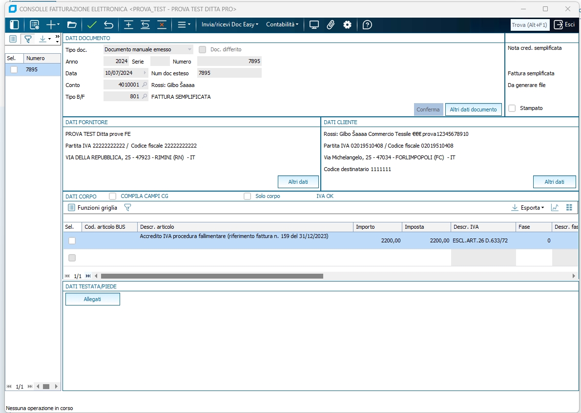 E' obbligatorio inserire nel corpo il codice IVA ma poiché l'aliquota non va indicata è necessario impostare anche la seguente opzione di registro: BSFECONS\OPZIONI\FattSempl_RiportaDatiIvaCorpo con valore 1 Se l'utente dispone del modulo Fattura elettronica Plus potrà anche effettuare la relativa registrazione di prima nota dalla consolle