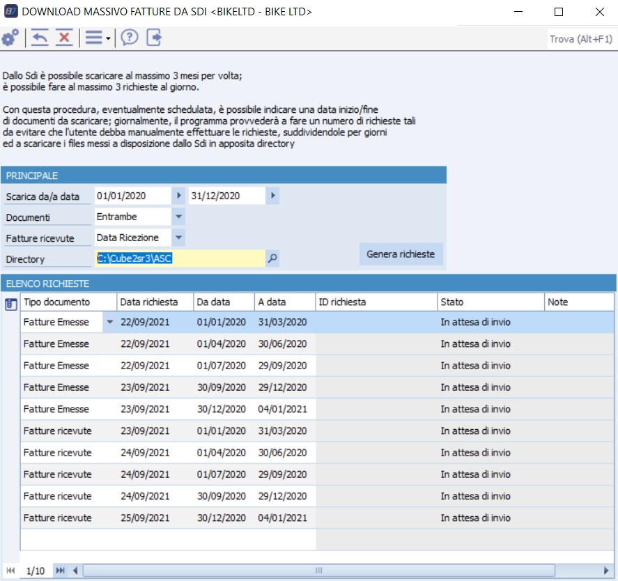 Le righe che verranno popolate avranno una data richiesta che parte dalla data di lancio di Genera Richieste, incrementato di un giorno, ogni 3 richieste. Attenzione. Se vengono lanciate in modo separato le richieste, ad esempio prima per le fatture emesse poi per le fatture ricevute, la data di inizio delle fatture ricevute (data richiesta), sarà incrementata di un giorno rispetto alla ultima data richiesta delle fatture emesse.