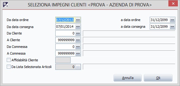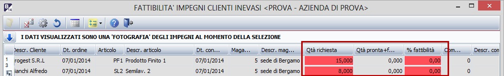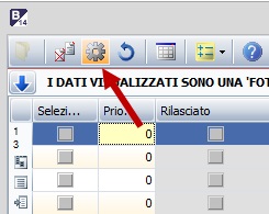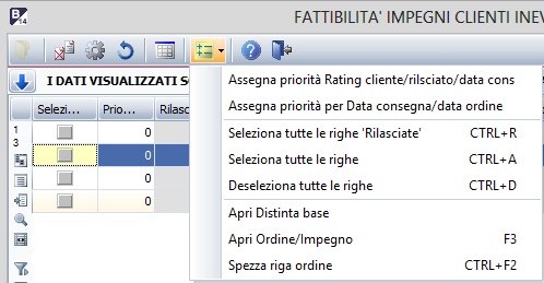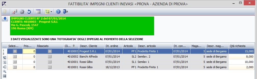 dopo aver dato la conferma sarà visualizzata una griglia con l'elenco delle righe degli impegni clienti non evasi e non prenotati, nella quale vengono indicati: Cliente/fornitore, data ordine, data consegna, magazzino, quantità Richiesta, commessa e sottocomessa di testata Impegno, Articolo, Descrizione Articolo, Codice Fase e Descrizione, esistenza di magazzino, disponibilità netta di magazzino, ordinato, impegnato, prenotato su quel magazzino, note riga, Rilasciato (non modificabile), la colonna 'quantità pronta + fattibile' con relativa Percentuale e due colonne il cui funzionamento e modalità operative sarà descritto in seguito, denominate 'priorità manuale' e 'Selezione Riga'.