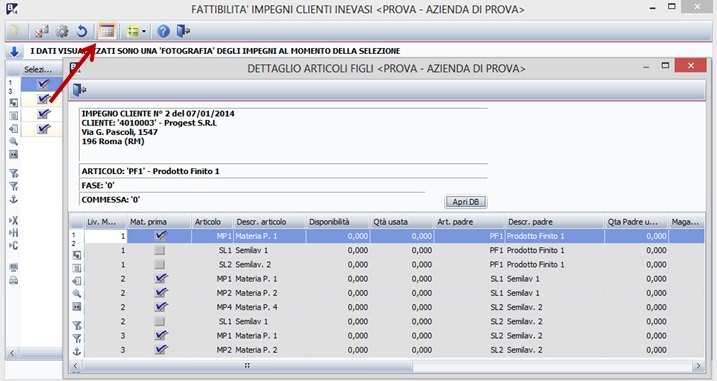NB: La disponibilità in griglia è quella effettiva attualmente presente a magazzino e non la residua dopo l'elaborazione. Non vengono visualizzati inoltre tutti i materiali della Distinta Base esplosa, se ad esempio ho un Prodotto Finito, PF1 composto da un semilavorato SL3, che a sua volta è composto da un semilavorato SL2 ed una materia prima MP1, se di SL2 ne sono presenti a sufficienza in magazzino non verranno visualizzati i materiali che lo compongono.
