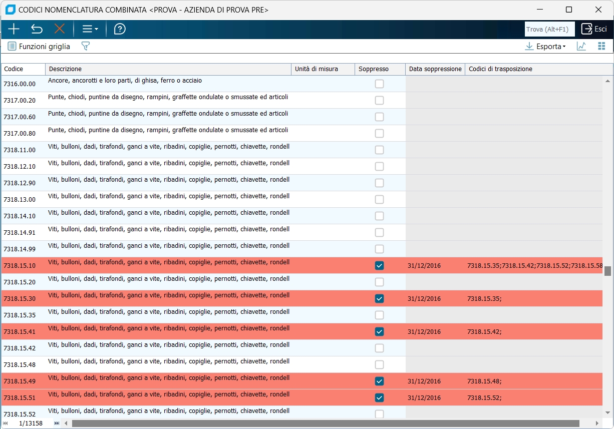 Il programma permette di gestire la storicizzazione dei codici di nomeclatura combinata con il campo 'soppresso', 'data soppressione' e il campo 'codici di trasposizione' contenente l'elenco dei codici sostituiti separati da ; (rilasciato dalla agenzia dogane).