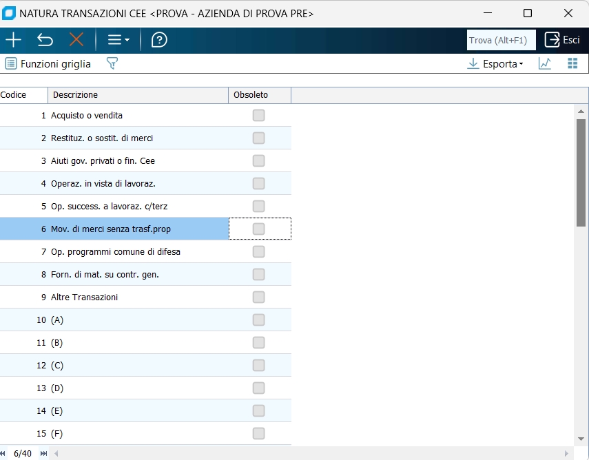 É consigliabile ricopiare questa tabella dagli archivi dell'azienda di prova con la funzione "Importa dati da altro DB" del programma "Gestione Aziende/Database".