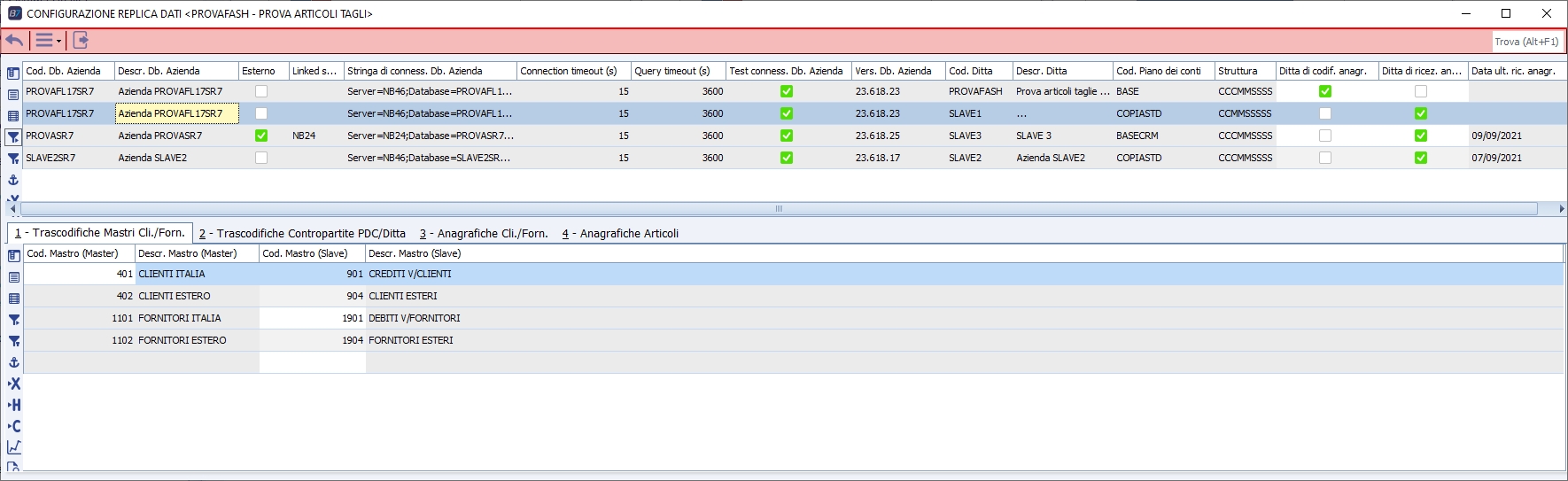 Per le ditte di tipo slave è possibile impostare la configurazione della sincronizzazione anagrafiche clienti\fornitori e anagrafiche articoli nella