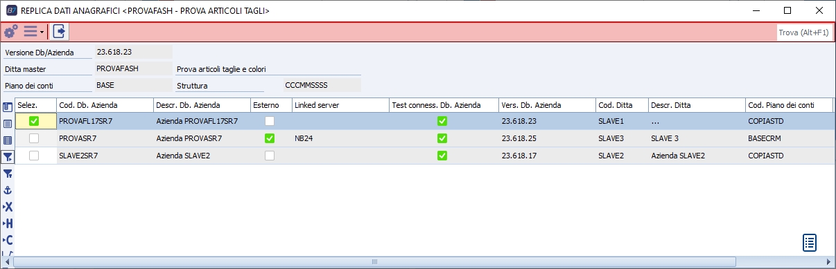 Propone in griglia le ditte codificate come ditte di ricezione dati (SLAVE) . L'utente può scegliere le ditte sulle quali trasferire le anagrafiche